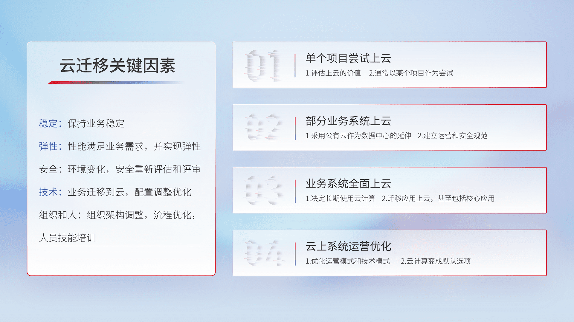 结合实际业务,,从规划设计、、、云平台选型、、、云原生改造、、数据迁移、、、、集成交付,,,迁移全过程为客户识别最佳上云路径,,,做好风险识别管理,,设计网络架构、、身份权限、、、、安全审计合规、、操作审计、、、日志审计、、、监控告警策略、、、、多站点容灾设计等,,,,对云上基础设施进行整体规划,,,提升IT治理水平,,以满足弹性、、、高可用、、高性能的需求。。。。