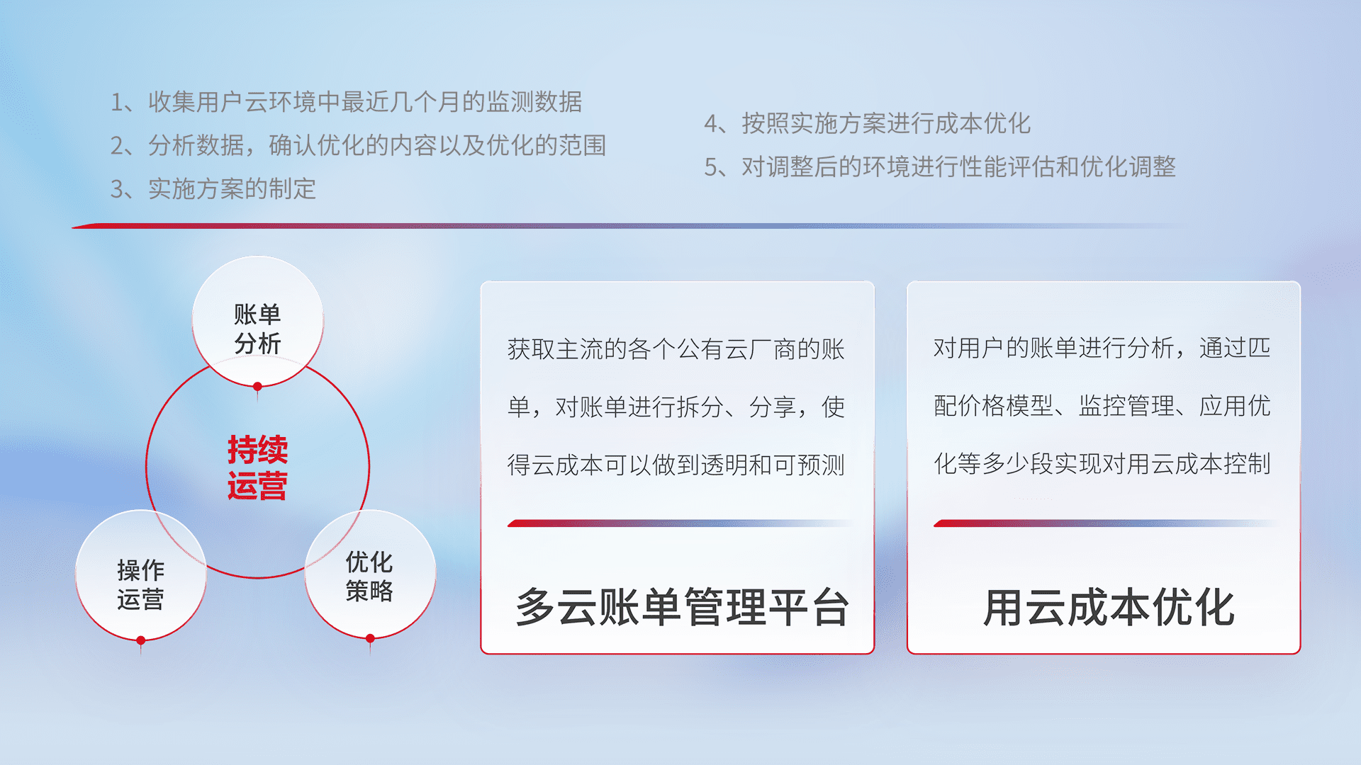 通过多云纳管,,,以统一的资源数据模型把客户的云资源进行抽象和封装,,,进而实现对多云资源的统一操作,,,保障云资源管理的可靠性、、、稳定性与可用性。。。量身定制化运维内容,,,配置、、、开发运维、、、补丁管理、、、备份、、监控、、、、认证和访问管理、、、审计和日常巡检等,,保障在用云过程中的可靠度,,,稳定度以及高可用率。。。